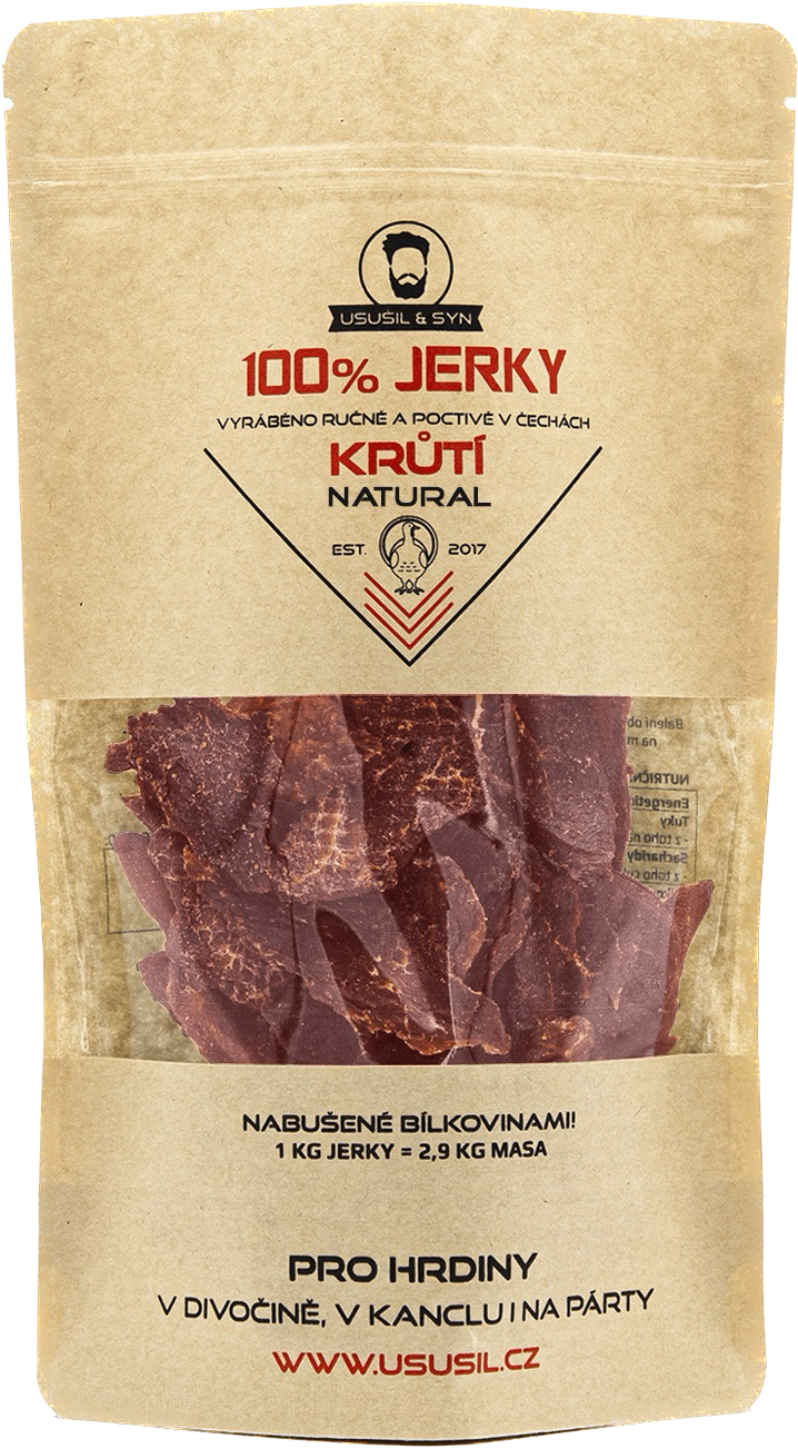 Pro příznivce bílého masa je tu Jerky Krůtí natural 100 % z krůtích prsou z českého chovu, které byly dochuceny pouze lehkým popraškem soli pro zachování přirozené chuti.